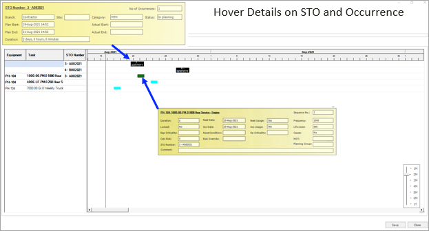 The screenshot below shows the details displayed when you hover over an STO and an Occurrence.