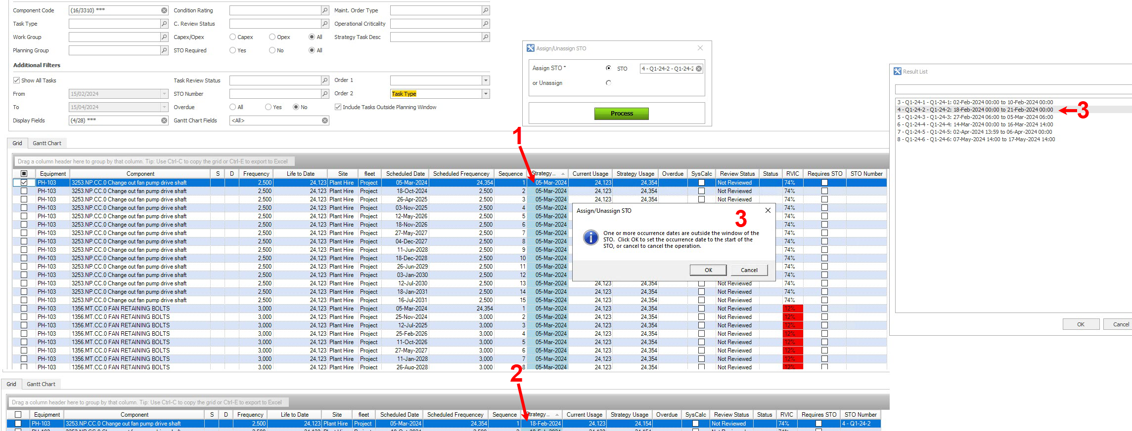See the example below, where the Occurrence was originally scheduled on 05-Mar-2024; this is outside the window of the STO (18-Feb-2024 to 21-Feb-2024). Based on the duration of the occurrence, AMT recognises this can be performed and provides the warning.