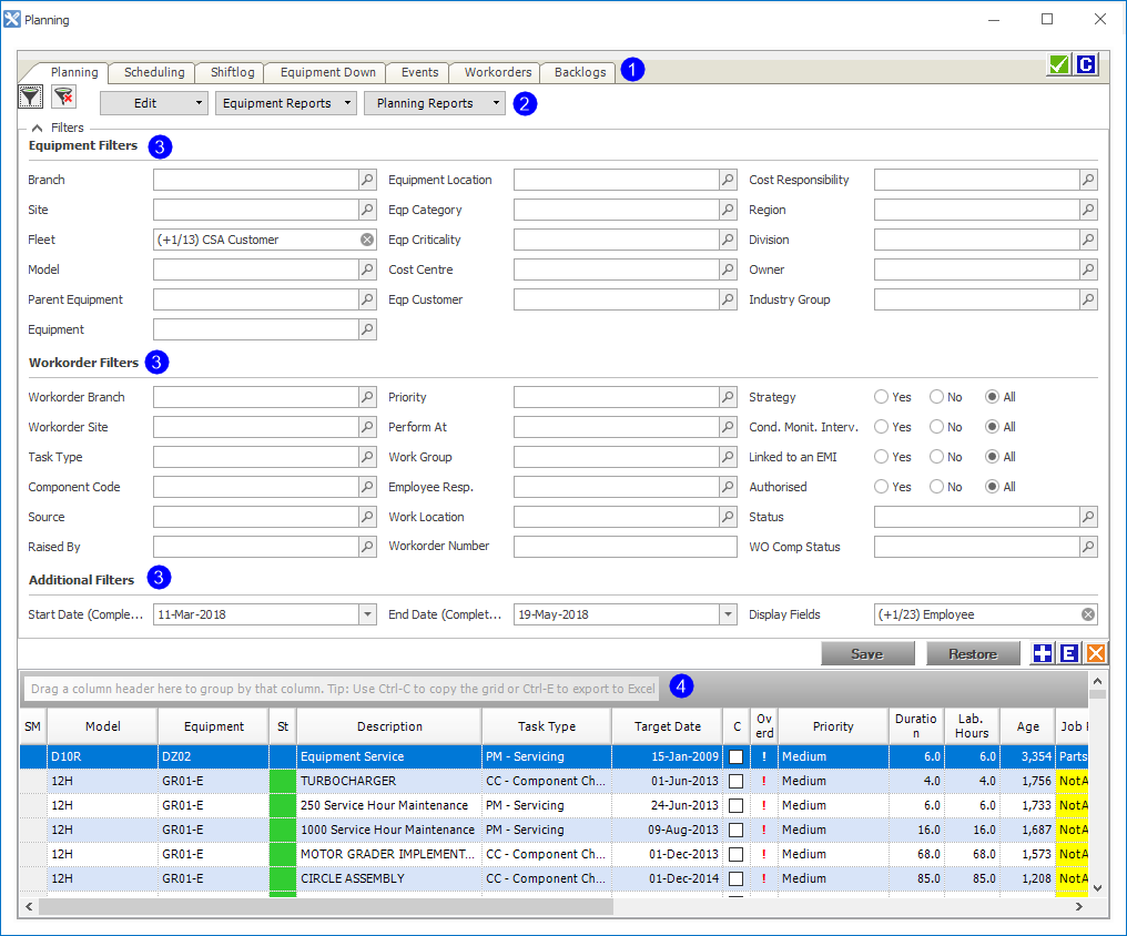 | Planning | The Planning grid shows all planning work orders - both strategy work orders (components and PMs) and defects. |