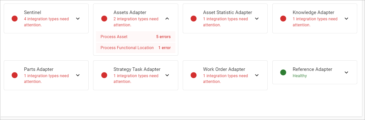 Each integration type is grouped by its adapter, and these adapters display as tiles with a red or green indicator. The down arrow displays the integration types associated with the adapter that are healthy or not healthy, and how many errors apply to that integration process. For example, in the screenshot below, the Asset Adapter has two areas that require further investigation - Process Asset, which has five errors and Process Functional Location, which has one error. By comparison, the Reference Adapter Process Fleet is healthy and displays in Green. |