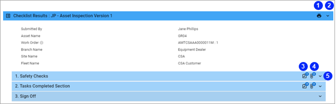 The result of the Checklist displays underneath the header detail. The information will display with the individual sections collapsed. Down arrows are included that can individually display each section or alternatively an Expand All down arrow displays in the toolbar next to the Print Option.