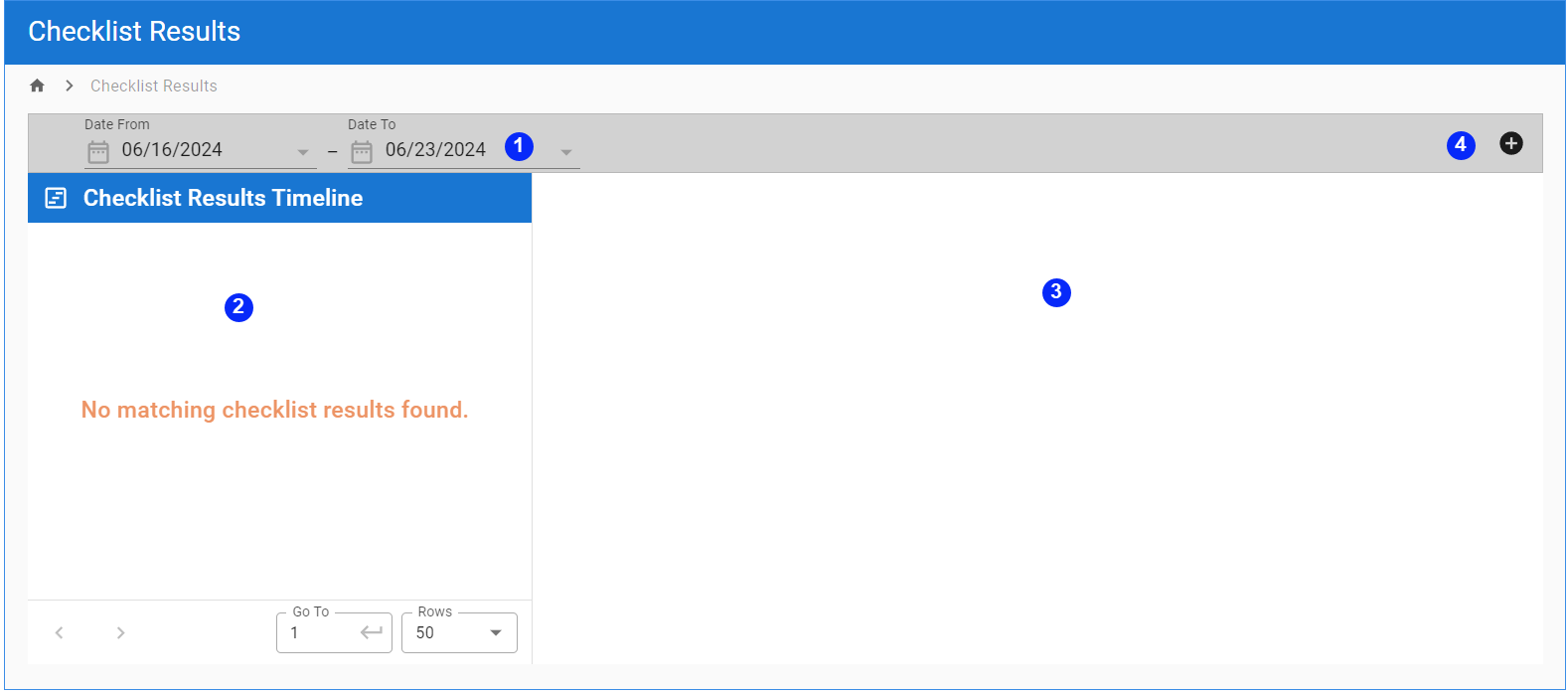 | 2 | Resultados de la lista de verificación de resumen en el orden de fechas (más reciente primero) según el filtro. Si selecciona un resultado, se mostrarán los resultados detallados en el panel derecho. |