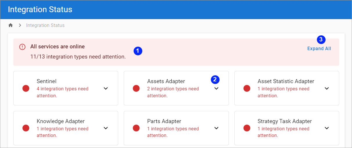 Cada tipo de integración se agrupa por su adaptador, y estos adaptadores se muestran como mosaicos con un indicador rojo o verde. La flecha hacia abajo muestra los tipos de integración asociados con el adaptador que están en buen estado o no, y cuántos errores se aplican a ese proceso de integración. Por ejemplo, en la captura de pantalla siguiente, el adaptador de activos tiene dos áreas que requieren una investigación más detallada: Activo del proceso, que tiene cinco errores, y Ubicación funcional del proceso, que tiene un error. En comparación, la flota del proceso del adaptador de referencia está en buen estado y se muestra en verde. Los errores se muestran en la parte superior de la tarjeta para que sean más fáciles de identificar. |
