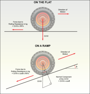 The rolling resistance is expressed as a percentage of the component of the gross vehicle weight that is normal (perpendicular) to the ground surface. The normal component of the gross vehicle weight changes within the haul profile as grade and truck payload change. The percentage rolling resistance also changes as the surface changes from smooth to rocky and rough. Therefore, the force due to the rolling resistance changes along the haul profile. The following diagram illustrates the way in which rolling resistance changes with ramp grade.