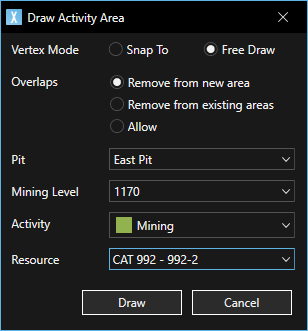 Drawing an activity area requires the selection of an Activity Type. Activities are set up in XECUTE Config. Additional options are shown in the image below.