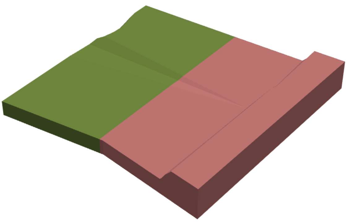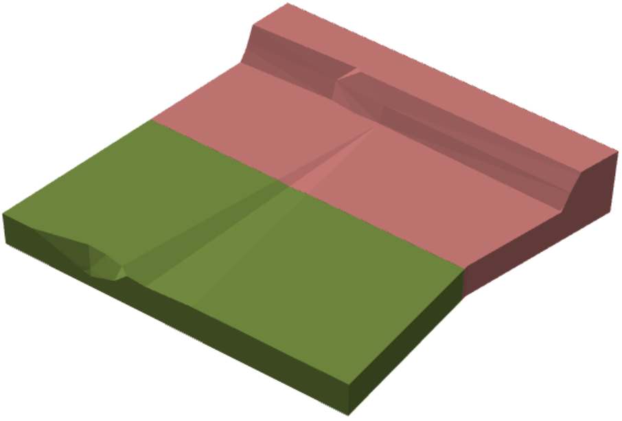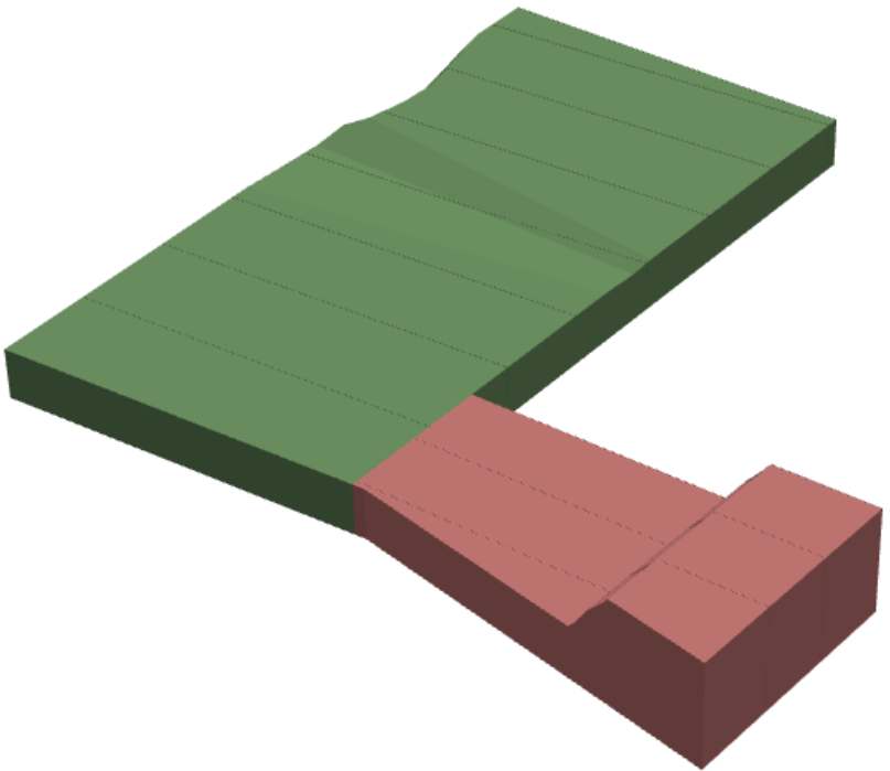 Two scheduled geometries. At this point in the schedule, 100% of the green activity area has been mined, and about 25% of the red activity area has been mined. | ||