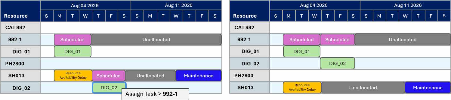 You can reassign an activity area task to a different resource using the Assign Task option from the right-click menu. This option removes the selected activity area from the original resource and adds it to the target resource. It’s placed at the end of the task list for that resource, following any existing activity area tasks already scheduled there.