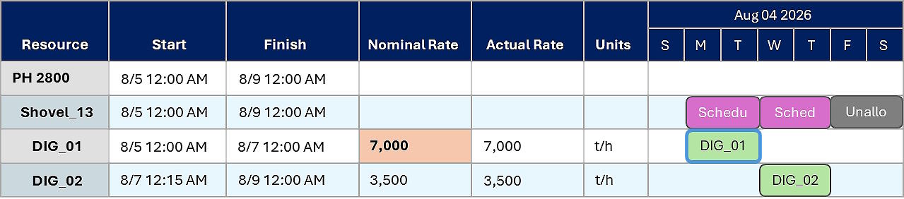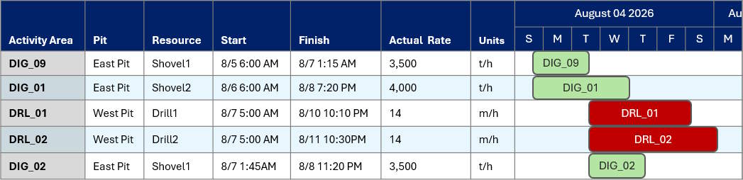 Delays can be inserted directly into the chart. The layout is fully customisable, allowing you to report specific columns such as resource, activity area, pit, and more. Tooltips provide further insights, including actual resource utilisation and greater details about the production rates applied to each task.
