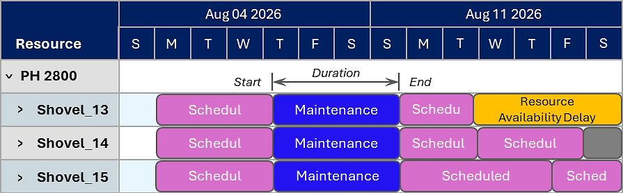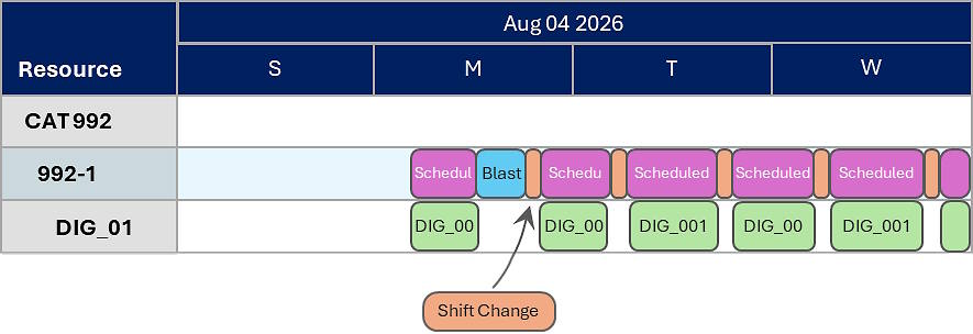 Let’s say blasting occurs throughout the schedule. The equipment in the blast radius must not be working during that time to maintain safety. The schedule must reflect the real delay incurred on all affected resources. The downtime of the resources should greater than the blast duration to ensure there’s enough time for resources and personnel to get out of the way and maintain an adequate safety margin. You can quickly schedule the resource downtime using time-based delays.