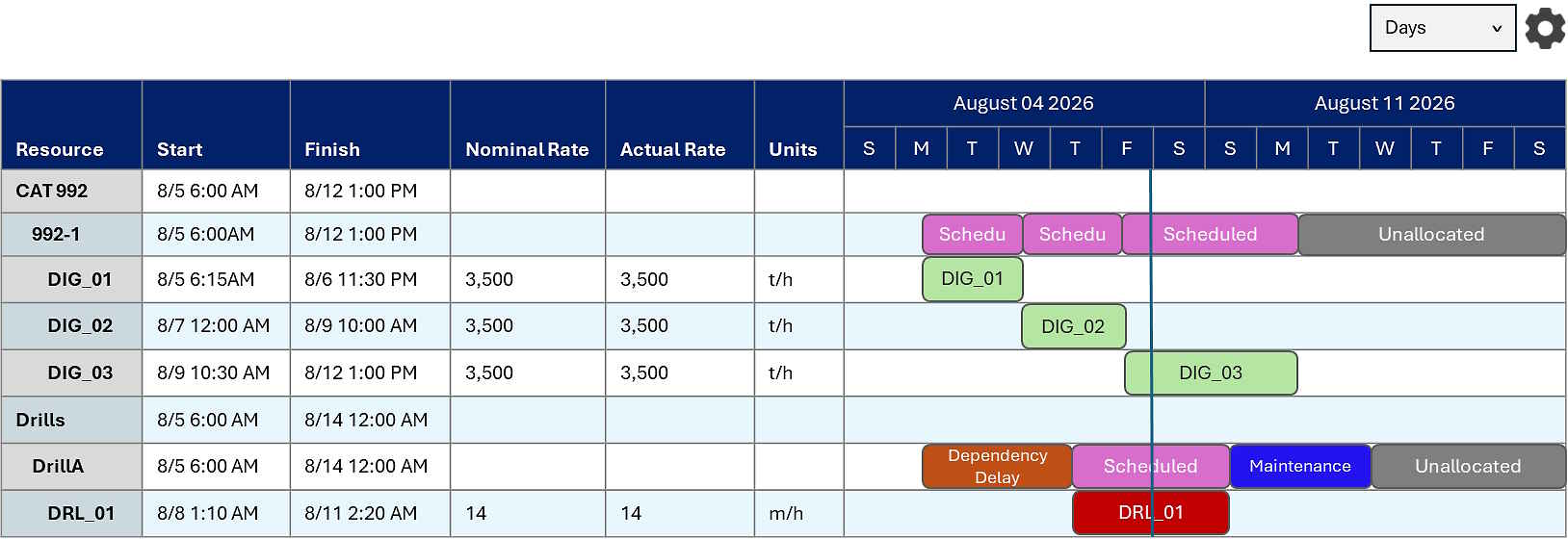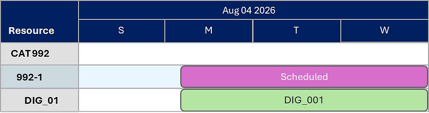 Resource Rows: Represent individual equipment or personnel. Each row shows all tasks assigned to that resource.