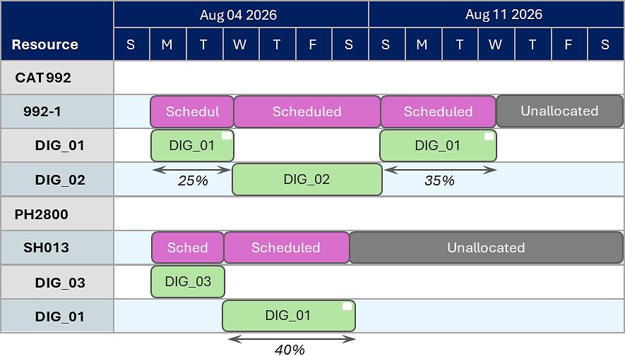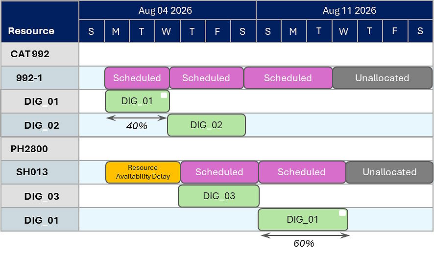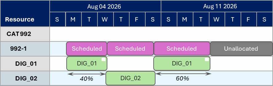 DIG_01 has a split allocation. In the first instance, the resource performs 40% of it.
