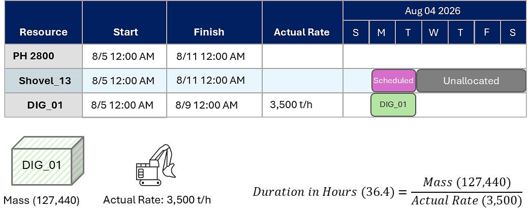Activity Area Mass (127,4000) / Actual Production Rate (3,500 t/h) = Task Duration (36.4 hours)