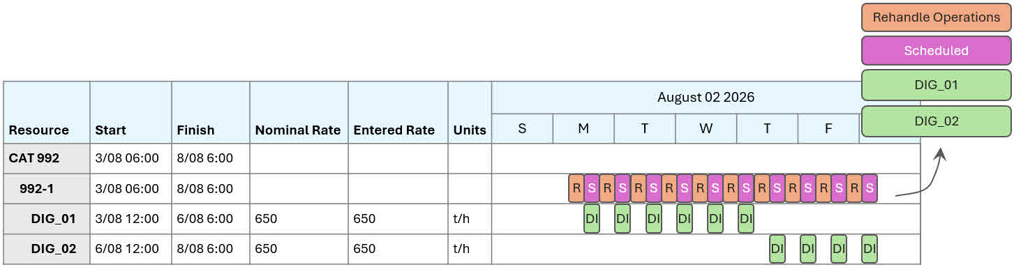 | Resource2 | Rehandle Operations | 800 t/h | 12 hours | 30 mins | 11.5 hours |
