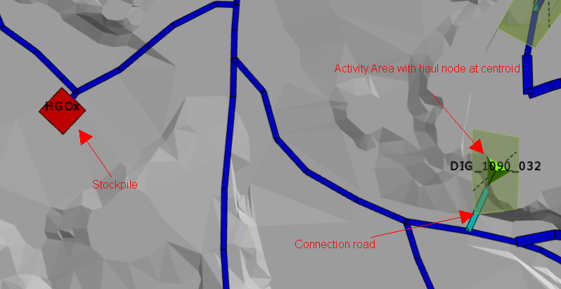 The image below shows an imported haul route (dark blue) in XECUTE with an imported destination node (HGOx stockpile). The auto-generated XECUTE connection road that connects the source node (activity area centroid) to the haul network is shown as light blue/cyan.