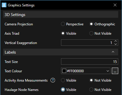 To show the haulage source and destination node text, click the Visible check box at Graphics Settings > Labels > Haulage Node Names.