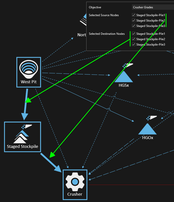 If the material arrow flows into or out of a Staged Stockpile node the objective rule can be enabled or disabled for each pile in the staged stockpile.