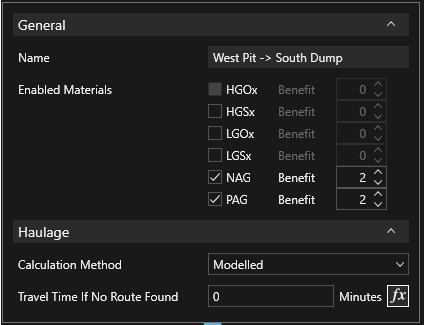 Modelled - This option is valid if a haulage model is imported into the site and will calculate the travel time between nodes based on the underlying haul network named locations.
