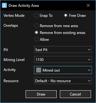 Create Mined Out Areas, in this instance draw the mined out area that intersects the activity areas and the face position will be updated. The area will be mined out over the extent of the new shape. Set the Overlap setting to Remove from existing areas so the areas are trimmed.