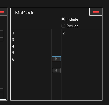 If the selected principal field has an aggregation type set to None,  the objective is treated as a filter  and will only allow material based on the Include or Exclude rule. In the image below, the MatCode field had unique values of 1 to 6 in the block model and these were listed in the left panel. The Include option was selected, and the code value 2 was moved to the right panel by clicking >. This applies a filter to only allow blocks with a MatCode value of 2 to satisfy the objective.
