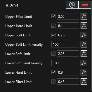 For quantity type objectives (min, max, and sum type principal fields), filters are not applicable and the block model is scanned to provide an initial range of values. You can then adjust these limits as required.