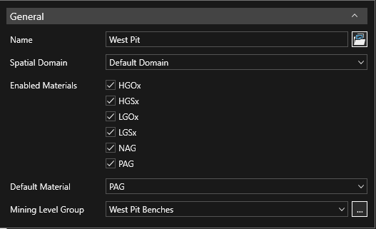 Mining Level Group - Select a mining level groupMining Level Group to apply to the pit, and use the ellipses button to open the Mining Levels screen should you need to modify or review the levels. To edit the mining level table the site must be stopped (Ready state). If no Mining Level Group is defined for the Pit, a single level of -10 is activated so any activity areas can be mined out.
