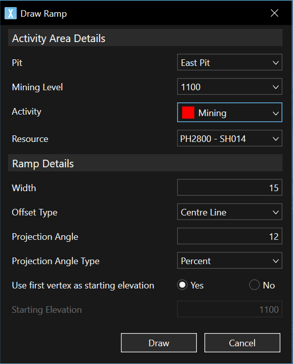 The dig blocks required to create a ramp can be designed in XECUTE. To create a ramp design click the Draw Ramp icon in the radial menu. The ramp will be created from the first drawn vertex elevation or the Starting Elevation and follow a Projection Angle along the mining direction.