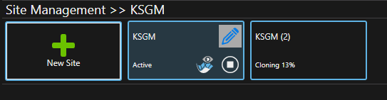The image below shows a locked site that is undergoing cloning. During this process the cloned site (KSGM (2)) is not available, but the original site (KSGM) is fully operational.