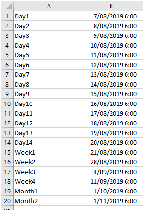 To configure a custom calendar create a simple csv file to define the periods and their start times. The period names are in column 1 and the period start date is in column 2. The period duration is period(n+1) start date - period(n) start date. A dummy period start date is required to set the last period end date.
