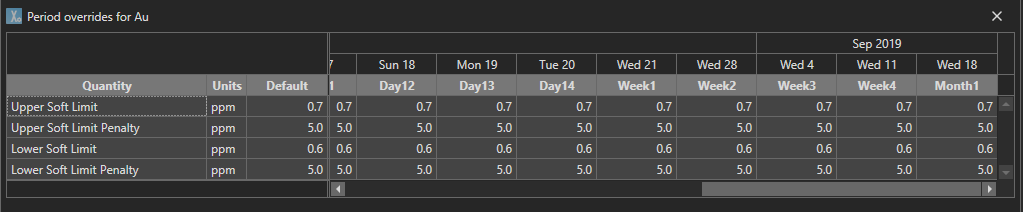 The periods can be of any duration and the duration of individual periods can change as the calendar progresses, for example you can start with a set number of days then transition to weeks and then months. All period overrides are based on the site calendar. A default site calendar is created for new sites with two 12 hour periods per day for 70 periods.
