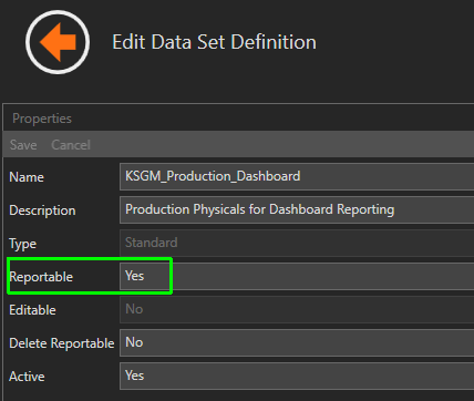 The image below shows the Reportable configuration setting in Integration Management Studio (IMS) for a Dataset Definition that is used in a Data Feed Out in XECUTE Config.