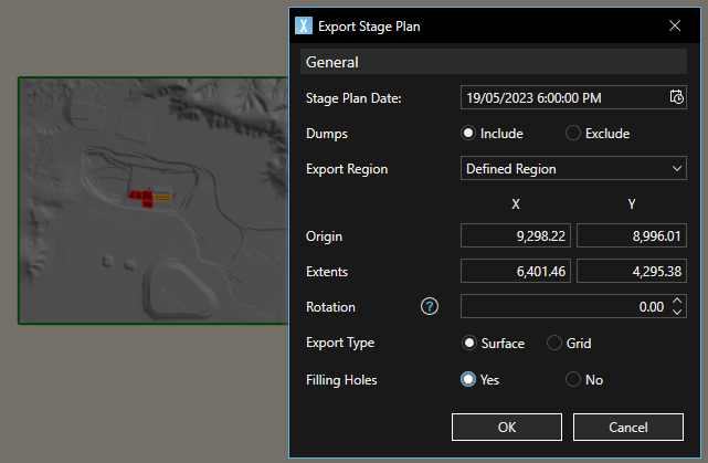 The image below shows a defined region to export a surface type staged plan. The green preview box on the left is adjusted as the origin and extents values are adjusted. The default setting is to export all extents.