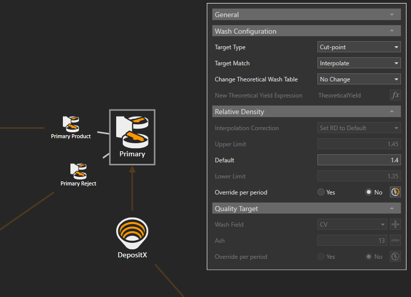A wash plant is a specialised process node that has two sub-processes, wash plant product and wash plant reject.