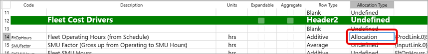 For allocation to occur, a non-aggregate spreadsheet must have at least one row assigned as an allocation row (for example, operating hours in an equipment template). This is the row from which values are used to calculate the allocation factors for all data rows below this row, down to the end of the spreadsheet or until a second allocation row is assigned.