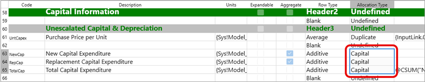 | Capital | The values in the row will be allocated using a allocation factor calculated using the average of allocation values over a range of periods. |