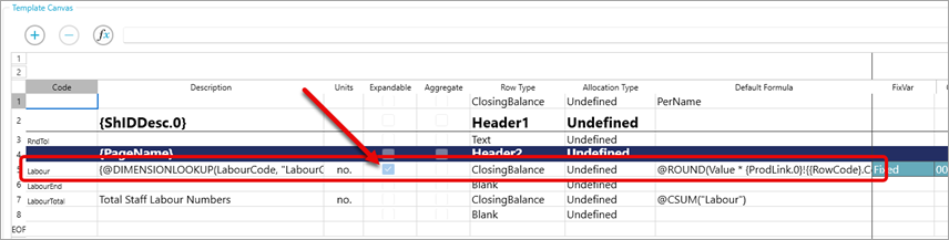 An expandable row is designed such that only one single row is required to be set up within the template. Then, at the spreadsheet level, users can add copies of that template row as required for that section in that specific worksheet. The spreadsheet will use the same underlying template row for each linked expandable row and will automatically append an index number (for example, #1) to the template row code, in order to specifically identify each spreadsheet expandable row.